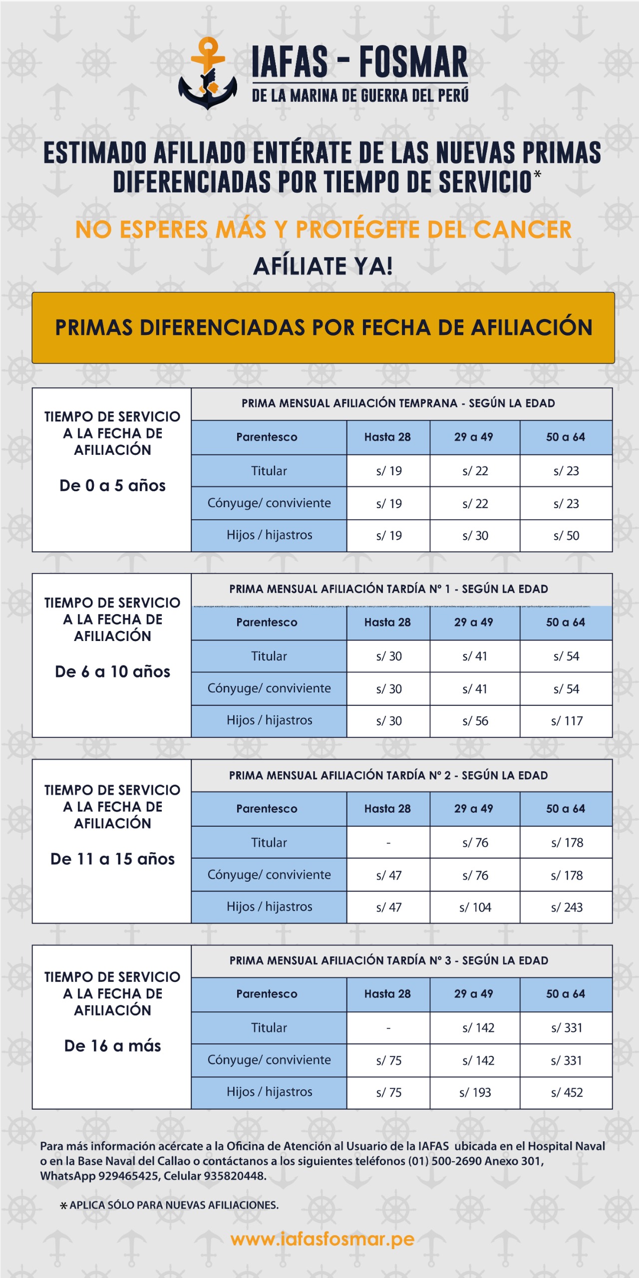 Nuestras primas no han variado desde el año 2017, lo cual hoy en día se ve reflejado en los distintos déficits que se pueden observar en la atención, empujandonos a buscar mejorar el seguro oncológico, y así poder brindarle a nuestra familia naval una atención adecuada para el tratamiento del cáncer.